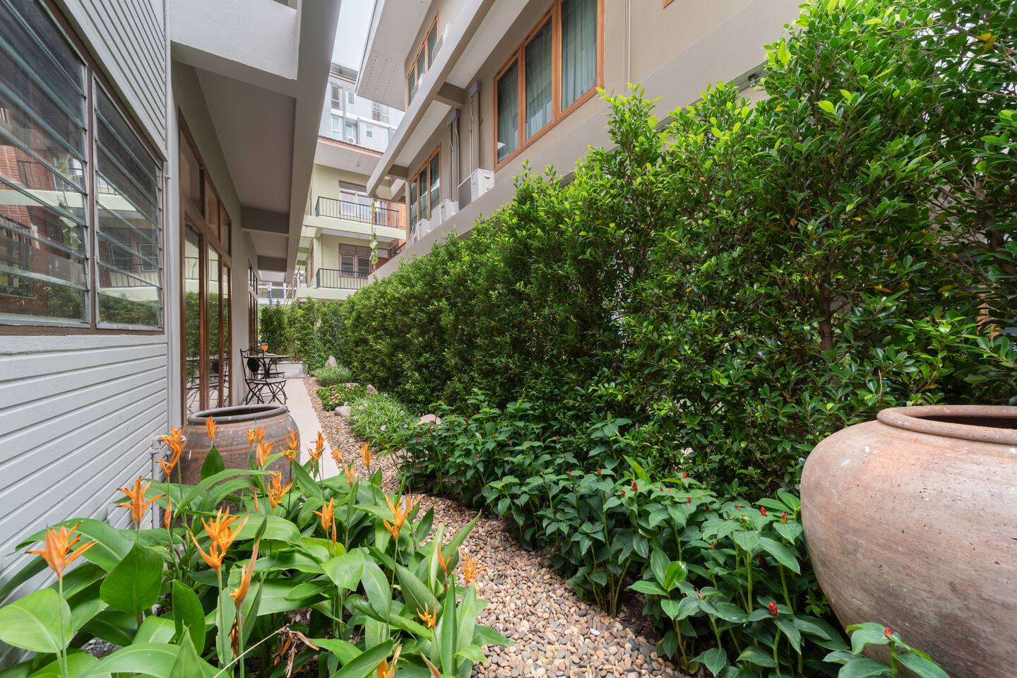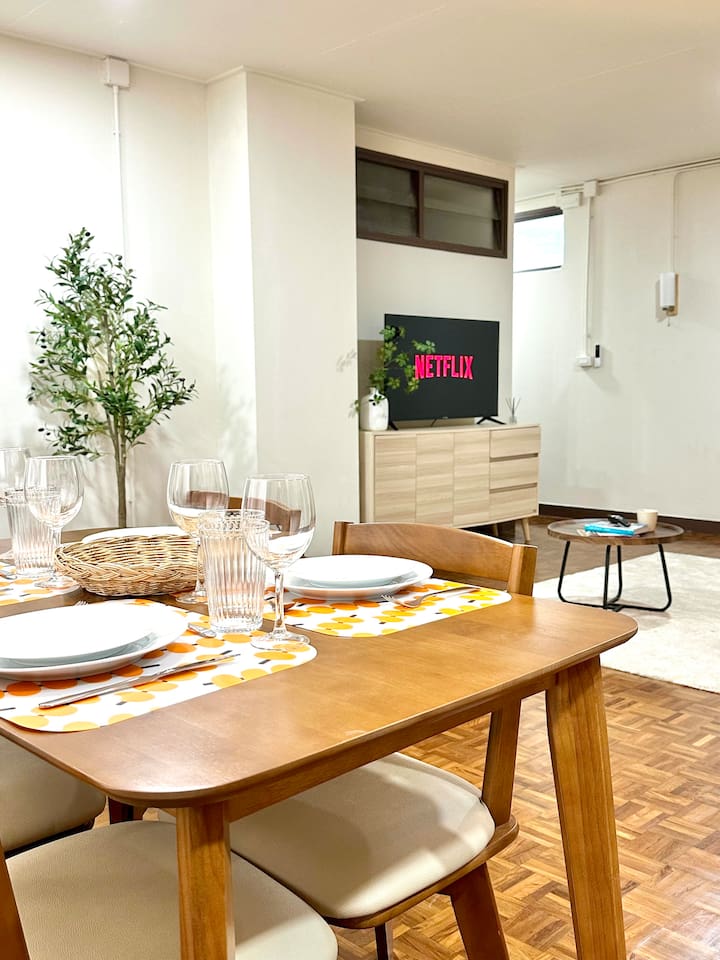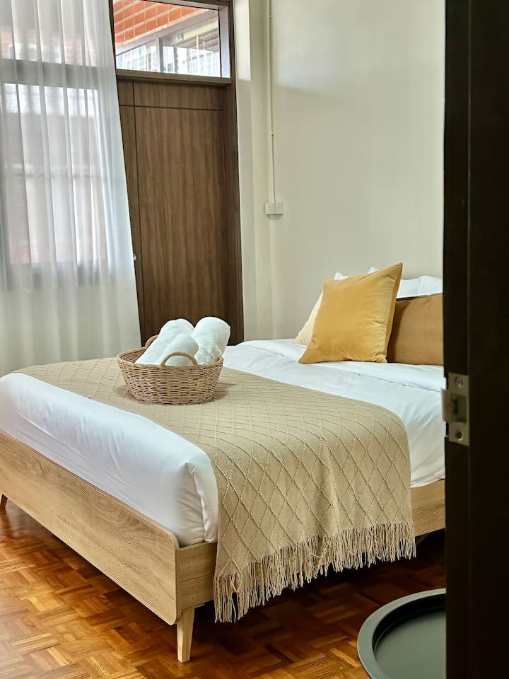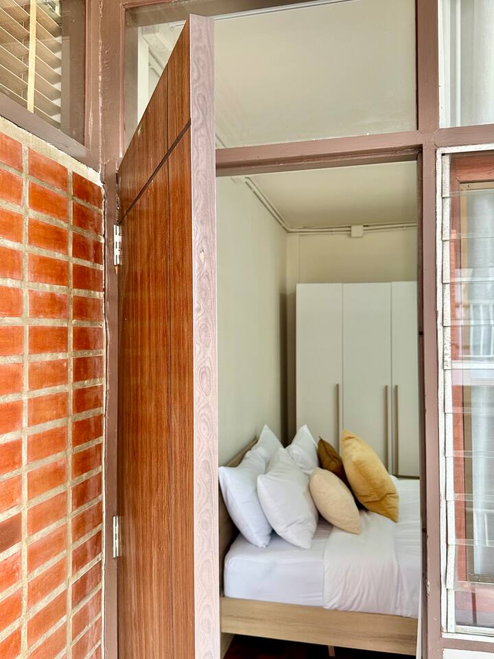 Welcome to BrickHaus Thonglor 🧱, a calm and stylish 2-bedroom apartment tucked in one of Bangkok’s most vibrant neighborhoods. Housed in a 1970s building with just four private units, this thoughtfully renovated home blends mid-century charm with modern comfort and a relaxed, harmonious vibe. Step inside to an open living area filled with natural light — perfect for unwinding, watching a movie, or even doing yoga. The dining area seats 4–6 guests and connects to a fully equipped kitchen with everything you need for home-style meals. ✨ You’ll love: • 🏢 Unique mid-century architecture, privately set on the 2nd floor • 🛋️ Spacious living area with Smart TV and inviting sofa bed • 🍳 Open kitchen with fridge, freezer, stove, coffee maker, toaster & cookware • 🛏️ Master bedroom with king bed, ensuite bathroom & large wardrobe • 🌇 Second bedroom with queen bed, wardrobe & private balcony with table and chairs • 🧺 Laundry area at the back with space to hang clothes under the Thai heat • 🚗 Free private parking • 💨 High-speed WiFi & easy self check-in 📍 Location Highlights BrickHaus sits in the heart of Thonglor — surrounded by trendy cafés, restaurants, and creative spaces: ☕ Parris Café 🍰 Cheesecake House & Beyond Bread 🍸 Tuba Restaurant 🛍️ The Commons & J Avenue 🚈 BTS Thong Lo / Ekkamai nearby, with EmQuartier, Emporium & Gateway Ekamai just one stop away. Whether you’re here to explore, work remotely, or simply enjoy slow mornings and peaceful evenings, BrickHaus Thonglor offers a warm, elegant home base in the heart of Bangkok.